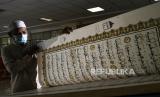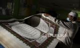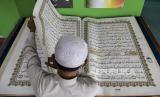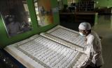 REPUBLIKA.CO.ID, JAKARTA -- Petugas merawat Al Quran raksasa di Perpustakaan Jakarta Islamic Centre (JIC), Jakarta Utara, Selasa (20/4/2021). Al Quran yang berukuran 100 x 50 centimeter dengan berat sekitar 100 kilogram tersebut dibersihkan setiap tiga hari sekali meskipun perpustakaan masih belum dibuka untuk umum karena masih dalam pandemi COVID-19.
