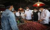 Menteri Perdagangan Muhammad Lutfi (ketiga kanan) didampingi Wakil Gubernur Jawa Timur Emil Elestianto Dardak (kedua kanan) dan Wali Kota Surabaya Eri Cahyadi (kanan) berbincang dengan pedagang bawang merah saat mengunjungi Pasar Induk Osowilangun, Surabaya, Jawa Timur, Selasa (20/4/2021). Kunjungan Menteri Perdagangan tersebut dalam rangka untuk melihat secara langsung ketersediaan stok bahan kebutuhan pokok dan memastikan harga pangan normal. (FOTO : ANTARA/Moch Asim)
