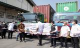 Menteri Perdagangan Muhammad Lutfi (tengah) Wakil Gubernur Jawa Timur Emil Dardak (ketiga kanan) Bupati Sidoarjo Ahmad Muhdlor Ali (ketiga kiri) memotong pita saat pelepasan produk ekspor PT Integra Indocabinet Tbk (WOOD) di Sedati, Sidoarjo, Jawa Timur, Selasa (20/4/2021). PT Integra Indocabinet Tbk (WOOD) mengirim produk Cysteine natural pertama ke pasar global dengan Ekspor sebesar 90% ke pasar Amerika Serikat (AS), sisanya ke Inggris dan negara lainnya dengan Nilai ekspor Integra pertahun senilai US$ 300-400 juta dengan total kontainer setahun sekitar 10.000 kontainer. (FOTO : ANTARA/Umarul Faruq)