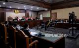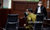 Mantan Menteri Sosial Juliari Peter Batubara menjalani sidang perdana pembacaan surat dakwaan terkait kasus dugaan korupsi dana paket bantuan sosial Covid-19 untuk wilayah Jabodetabek tahun 2020 di Pengadilan Tipikor, Jakarta, Rabu (21/4). Jaksa penuntut umum (JPU) Komisi Pemberantasan Korupsi (KPK) mendakwa mantan Menteri Sosial Juliari Peter Batubara menerima suap sebesar Rp 32,4 miliar dari para pengusaha yang menggarap proyek pengadaan bantuan sosial untuk penanganan Covid-19. (FOTO : Republika/Thoudy Badai)