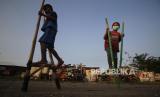 REPUBLIKA.CO.ID, SURABAYA -- Dua anak bermain egrang saat ngabuburit dengan memainkan permainan (dolanan) tradisional anak-anak di Kampung Dolanan, Surabaya, Jawa Timur, Rabu (21/4). Kegiatan ngabuburit dolanan tersebut bertujuan untuk melestarikan permainan tradisional sekaligus menunggu datangnya waktu berbuka puasa.