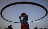 Seorang anak bermain hula hoop saat ngabuburit dengan memainkan permainan (dolanan) tradisional anakdi Kampung Dolanan, Surabaya, Jawa Timur, Rabu (21/4/2021). Kegiatan ngabuburit dolanan tersebut bertujuan untuk melestarikan permainan tradisional sekaligus menunggu datangnya waktu berbuka puasa. ANTARA FOTO/Moch Asim/rwa. (FOTO : ANTARA FOTO)
