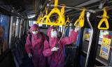REPUBLIKA.CO.ID, SOLO -- Petugas menyempotkan disinfektan pada bus Batik Solo Trans (BST) di Terminal Tipe A Tirtonadi Solo, Jawa Tengah, Kamis (22/4/2021).