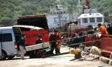Tim Komite Nasional Keselamatan Transportasi (KNKT) melihat peralatan yang akan dinaikan ke atas KN SAR Antasena di Pelabuhan Tanjung Wangi Banyuwangi, Jawa Timur, Jumat (23/4/2021). Badan Pencarian dan Penyelamatan Nasional (Basarnas) mendatangkan satu unit alat pendeteksi benda bawah laut remote operation vehicle (ROV) untuk membantu proses pencarian kapal selam KRI Nanggala-402 yang hilang kontak sejak Rabu (21/4) pagi di perairan utara Laut Bali . (FOTO : Antara/Budi Candra Setya)