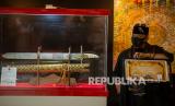 Petugas berjaga di dekat salah satu koleksi dalam Pameran Artefak Nabi Muhammad SAW di Jakarta Islamic Center, Koja, Jakarta, Sabtu (24/4/2021). Pameran yang berlangsung hingga 3 Mei 2021 tersebut memamerkan 35 barang peninggalan Nabi Muhammad dan para sahabatnya, mulai dari perlengkapan perang, tongkat hingga janggut dan rambut Nabi. Koleksi artefak tersebut dikumpulkan dari berbagai tempat bersejarah, antara lain Mesir, Kairo, Mekah dan Madinah. (FOTO : Antara/Aditya Pradana Putra)