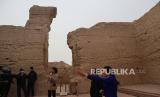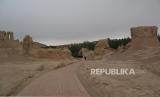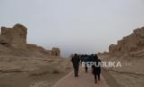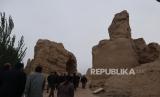 REPUBLIKA.CO.ID, XINJIANG -- Delegasi media asing bersama para pejabat Daerah Otonomi Xinjiang berjalan memasuki pintu gerbang situs bekas Ibu Kota Kerajaan Jushi di Turban, Xinjiang, China, Jumat (23/4). Reruntuhan ibu kota yang dibangun pada tahun 108 Sebelum Masehi yang merupakan poros penting Jalur Sutera itu kini menjadi objek wisata sejak ditetapkan UNESCO sebagai situs warisan dunia pada 2014.