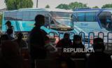 Penumpang menunggu jadwal keberangkatan bus di Terminal Kampung Rambutan, Jakarta, Senin (26/4). Jumlah penumpang di Terminal Kampung Rambutan mengalami penurunan hingga 40 persen menyusul adanya adendum Surat Ederan Satuan Tugas Penanganan COVID-19 tentang pengetatan persyaratan Pelaku Perjalanan Dalam Negeri (PPDN) selama H-14 peniadaan mudik atau 22 April - 2 Mei 2021 hingga H+7 peniadaan mudik 18 Mei - 24 Mei 2021. Republika/Thoudy Badai (FOTO : Republika/Thoudy Badai)