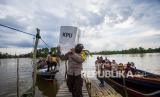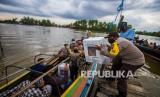 REPUBLIKA.CO.ID, BANJARMASIN -- Petugas kepolisian membawa kotak suara saat mendistribusikan logistik pemungutan suara ulang (PSU) ke TPS di Pulau Bromo, Banjarmasin, Kalimantan Selatan, Selasa (27/4/2021). Komisi Pemilihan Umum (KPU) Kota Banjarmasin mulai mendistribusikan logistik untuk pelaksanaan pemungutan suara ulang Pilkada Kota Banjarmasin tahun 2020 di tiga kelurahan di Kecamatan Banjarmasin Selatan pada 28 April 2021.