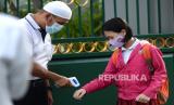 Petugas mengukur suhu tubuh siswa pada hari pertama ujicoba pembelajaran tatap muka di SDN Lempuyangwangi, Yogyakarta, Rabu (28/4). Pemkot Yogyakarta menggelar ujicoba pembelajaran tatap muka di lima SD dan lima SMP. Periode ujicoba mulai 28 April hingga 7 Mei dan kelas yang ikut sangat dibatasi. Untuk SMP yang mengikuti PTM kelas VII dan VIII, sedangkan SD kelas IV dan V. (FOTO : Wihdan Hidayat / Republika)