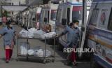 REPUBLIKA.CO.ID, AHMEDABAD -- Sejumlah ambulans yang membawa pasien COVID-19 saat mengantre menunggu giliran untuk dirawat di rumah sakit pemerintah Covid-19, Ahmedabad, India, Selasa (27/4). Penuhnya rumah sakit membuat para pasien Covid-19 terpaksa harus dirawat di dalam ambulans. Tercatat angka kematian di India akibat virus Covid-19 telah mencapai 200.000 jiwa.