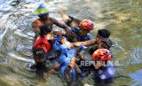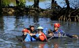 REPUBLIKA.CO.ID, MAROS -- Petugas dari Balai Besar Konservasi Sumber Daya Alam (BKSDA) Sulsel bersama Pemadam Kebakaran dan dibantu warga mengevakuasi seekor lumba-lumba gigi kasar (steno bredanensis) saat proses evakuasi menuju lepas pantai di Desa Marannu, Kabupaten Maros, Sulawesi Selatan, Jumat (30/4/2021). Lumba-lumba tersebut berhasil dievakuasi ke lepas pantai setelah terperangkap masuk di tambak ikan warga.