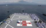Prajurit TNI menggelar Upacara Tabur Bunga di geladag Helly KRI Dr. Soeharso-990 di perairan utara Bali , Jawa Timur, Jumat (30/4/2021). Upacara itu digelar sebagai penghormatan terahir bagi awak KRI Nanggala 402 yang gugur dalam medan tugas. (FOTO : ANTARA FOTO)