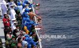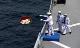 REPUBLIKA.CO.ID, BALI -- Kepala Staf TNI Angkatan Laut Laksamana Yudo Margono melepas karangan bunga ke laut pada Upacara Tabur Bunga di geladag Helly KRI Dr. Soeharso-990 di perairan utara pulau Bali, Bali, Jumat (30/4). Upacara itu digelar sebagai penghormatan terahir bagi awak KRI Nanggala 402 yang gugur dalam medan tugas.