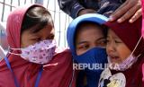 Keluarga awak KRI Nanggala 402 menangis saat menggelar Tabur Bunga dari geladag Helly KRI Dr Soeharso-990 di perairan utara pulau Bali, Bali, Jumat (30/4/2021). Kegiatan tabur bunga yang diikuti dari 53 keluarga awak KRI Nanggala 402 yang tenggelam diperairan utara Bali itu diwarnai kesedihan keluarga korban. (FOTO : Antara/Budi Candra Setya)
