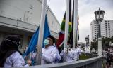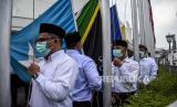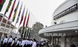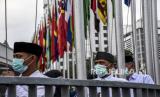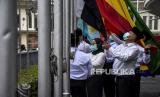 REPUBLIKA.CO.ID, BANDUNG -- Petugas pengibar bendera menurunkan bendera-bendera negara anggota Konferensi Asia Afrika (KAA) di Museum Konferensi Asia Afrika, Jalan Asia Afrika, Kota Bandung, Jumat (30/4).