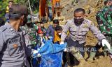 Petugas gabungan dari TNI, Polri dan BPBD Kabupaten Tapanuli Selatan mengevakuasi jenazah korban tanah longsor di areal proyek pembangunan Pembangkit Listrik Tenaga Air (PLTA) Batang Toru, Kecamatan Batang Toru, Kabupaten Tapanuli Selatan, Sumatera Utara, Jumat (30/4/2021). (FOTO : Dok BPBD Tapanuli Selatan/ANTARA)