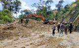 Petugas mengoperasikan alat berat untuk mencari jenazah korban tanah longsor di areal proyek pembangunan Pembangkit Listrik Tenaga Air (PLTA) Batang Toru, Kecamatan Batang Toru, Kabupaten Tapanuli Selatan, Sumatera Utara, Jumat (30/4/2021). (FOTO : ANTARA/Dok BPBD Tapanuli Selatan)