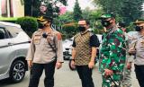 Kapolresta Bogor Kota Kombes Pol Susatyo Purnomo Condro (kiri), Wali Kota Bogor Bima Arya Sugiarto (tengah), dan Komandan Kodim 0606 Kota Bogor Kolonel Inf Roby Bulan (kanan) memantau penerapan ganjil-genap di check point Tugu Kujang, Sabtu (1/5). (FOTO : Republika/Shabrina Zakaria)