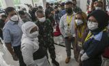 Menteri Ketenagakerjaan Ida Fauziyah (kedua kiri) bersama Direktur Utama BPJAMSOSTEK Anggoro Eko Cahyo (kiri) dan Kepala Pusat Kesehatan (Kapuskes) TNI Mayjen TNI Tugas Ratmono (ketiga kiri) berbincang dengan tenaga kesehatan saat kegiatan penyerahan paket lebaran kepada tenaga kesehatan dan non kesehatan di Rumah Sakit Darurat Penanganan COVID-19 Wisma Atlet Kemayoran, Jakarta, Sabtu (1/5/2021). Dalam rangka memperingati Hari Buruh Internasional, BPJAMSOSTEK memberikan bantuan paket Ramadhan kepada 1.600 tenaga kesehatan serta memberikan dana perlindungan jaminan sosial kepada 2.404 tenaga kesehatan dan non kesehatan sebagai bentuk solidaritas sesama pekerja. (FOTO : ANTARA/Galih Pradipta)