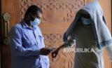 Seorang petugas mengukur suhu tubuh jamaah sebelum melaksanakan Shalat Jumat di masjid Al-Jaffali, Jeddah, Arab Saudi, Jumat (30/4). Selama Ramadhan 1442 Hijriah ini umat Muslim bisa menyelenggarakan Shalat berjamaah di Masjid dengan mematuhi protokol kesehatan seperti mengenakan masker dan menjaga jarak sosial untuk menghindari penyebaran virus Covid-19. (AP Photo/Amr Nabil) (FOTO : AP/Amr Nabil)