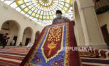 Seorang petugas melipat sajadah usai pelaksanaan Shalat Jumat di masjid Al-Jaffali, Jeddah, Arab Saudi, Jumat (30/4). Selama Ramadhan 1442 Hijriah ini umat Muslim bisa menyelenggarakan Shalat berjamaah di Masjid dengan mematuhi protokol kesehatan seperti mengenakan masker dan menjaga jarak sosial untuk menghindari penyebaran virus Covid-19. (AP Photo/Amr Nabil) (FOTO : AP/Amr Nabil)