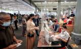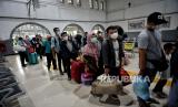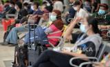 Calon penumpang memadati Stasiun Pasar Senen, Jakarta, Ahad (2/5). Jelang pemberlakukan larangan mudik pada 6-17 Mei 2021 Stasiun tersebut mengalami lonjakan penumpang yang hendak melakukan mudik lebih awal.  (FOTO : Republika/Thoudy Badai)