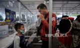 Calon penumpang  melakukan pemdaftaran sebelum menggunakan alat pendeteksi lewat pernapasan, GeNose, untuk tes Covid-19 di Stasiun Pasar Senen, Jakarta, Ahad (2/5).  (FOTO : Republika/Thoudy Badai)