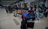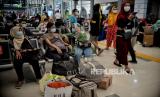 Calon penumpang memadati stasiun saat menunggu jadwal keberangkatan kereta di Stasiun Pasar Senen, Jakarta, Ahad (2/5).  (FOTO : Republika/Thoudy Badai)
