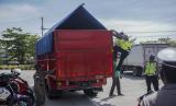 Petugas kepolisian memeriksa isi bak truk di Exit Tol Setono, Pekalongan, Jawa Tengah, Senin (3/5/2021). Pemeriksaan jalur mudik oleh petugas gabungan tersebut dilakukan untuk pengetatan pergerakan warga jelang pelarangan masa mudik pada 6-17 Mei 2021 sebagai upaya pencegahan penyebaran COVID-19. (FOTO : ANTARA/Harviyan Perdana Putra)