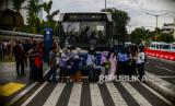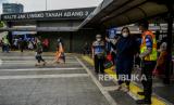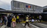 Penumpang yang akan menaiki KRL dialihkan memakai bus Transjakarta di Stasiun Tanah Abang, Jakarta, Senin (3/5). PT Kereta Commuter Indonesia (KCI) mula Senin (3/4), melakukan rekayasa perjalanan untuk kereta rel listrik (KRL) yang berhenti ataupun melintasi Stasiun Tanah Abang pada pukul 15.00 hingga 19.00 WIB, untuk mengantisipasi lonjakan penumpang dari Pasar Tanah Abang. (FOTO : Republika/Putra M. Akbar)