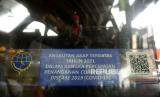Petugas menempelkan stiker khusus angkutan AKAP terbatas di Terminal Pulo Gebang, Jakarta, Selasa (4/5). Kemenhub menerbitkan stiker khusus bagi bus yang akan tetap beroperasi mengangkut penumpang pada momen Lebaran. Bus dengan stiker khusus tersebut bukan melayani pemudik, tapi masyarakat yang melakukan perjalanan selain mudik atau dengan kebutuhan mendesak dan telah memenuhi syarat serta ketentuan sesuai peraturan dari satgas dan Kemenhub.Prayogi/Republika. (FOTO : Prayogi/Republika.)