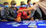 Penumpang bus antarkota antarprovinsi (AKAP) rute Jakarta-Medan mengambil kembali kartu identitas miliknya usai pendataan saat penyekatan pemudik di Jalan Lintas Timur Sumatera, Mestong, Muarojambi, Jambi, Selasa (4/5/2021). Polda Jambi bersama personel gabungan dari TNI dan instansi terkait mulai memperketat penyekatan arus mudik di sembilan titik jalur masuk darat, laut, dan udara daerah itu terkait larangan mudik Lebaran 2021 guna mencegah penularan COVID-19.  (FOTO : Antara/Wahdi Septiawan)