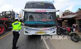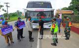 REPUBLIKA.CO.ID, JAMBI -- Petugas kepolisian menahan laju bus antarkota antarprovinsi (AKAP) rute Jakarta-Medan saat penyekatan pemudik di Jalan Lintas Timur Sumatera, Mestong, Muarojambi, Jambi, Selasa (4/5/2021).