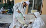 REPUBLIKA.CO.ID, Panitia menimbang beras dari warga saat pembayaran zakat fitrah di Masjid Al Wasilah, Kampung Cinta Rasa, Kota Tasikmalaya, Jawa Barat, Selasa (4/5/2021). Panitia pengumpulan zakat fitrah di masjid tersebut menerima pembayaran zakat fitrah oleh warga sambil menggunakan Alat Pelindung Diri (APD) COVID-19 untuk mensosialisasikan tentang pentingnya protokol kesehatan.