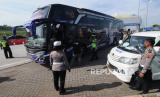 Sejumlah personel gabungan dari Satlantas Polres Boyolali dan Dinas Perhubungan Kabupaten Boyolali menghentikan sebuah bus penumpang dari luar kota saat penyekatan pemudik awal di Exit Tol Boyolali, Jawa Tengah, Selasa (4/5/2021). Penyekatan tersebut digelar untuk memeriksa surat kelengkapan kesehatan bebas COVID-19 dari para penumpang menjelang diberlakukannya larangan mudik 6-17 Mei 2021.  (FOTO : Aloysius Jarot Nugroho/ANTARA )