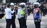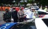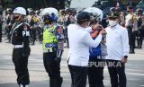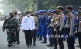Gubernur Jawa Barat Ridwan Kamil secara simbolis memasang tanda pada petugas saat Apel Gelar Pasukan Operasi Ketupat Lodaya 2021, di Kawasan Gasibu, Jalan Diponegoro, Kota Bandung, Rabu (5/5). Pada pelaksanaan Operasi Ketupat Lodaya 2021 akan diberlakukan larangan mudik 6-17 Mei 2021 dan penyekatan jalan sebagai upaya mencegah penyebaran Covid-19. (FOTO : Edi Yusuf/Republika)