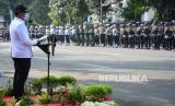 Gubernur Jawa Barat Ridwan Kamil menyampaikan sambutan saat Apel Gelar Pasukan Operasi ketupat Lodaya 2021, di Kawasan Gasibu, Jalan Diponegoro, Kota Bandung, Rabu (5/5). Pada pelaksanaan Operasi Ketupat Lodaya 2021 akan diberlakukan larangan mudik 6-17 Mei 2021 dan penyekatan jalan sebagai upaya mencegah penyebaran Covid-19. (FOTO : Edi Yusuf/Republika)