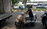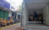 Pekerja mendorong paket motor untuk ke dalam truk sebelum dikirim melalui jasa ekspedisi kereta di Jalan Bungur Raya, Senen, Jakarta, Rabu (5/5). Meskipun pengiriman motor ke berbagai kota di pulau Jawa mengalami peningkatan seiring mendekatnya hari raya Lebaran, Namun menurut pekerja jumlah pengiriman paket motor menurun sejak 2 tahun ini akibat imbas pandemi dibandingkan sebelum pandemi Covid-19Prayogi/Republika. (FOTO : Prayogi/Republika.)