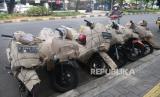 Sejumlah paket motor berjejer sebelum dikirim melalui jasa ekspedisi kereta di Jalan Bungur Raya, Senen, Jakarta, Rabu (5/5). Meskipun pengiriman motor ke berbagai kota di pulau Jawa mengalami peningkatan seiring mendekatnya hari raya Lebaran, Namun menurut pekerja jumlah pengiriman paket motor menurun sejak 2 tahun ini akibat imbas pandemi dibandingkan sebelum pandemi Covid-19Prayogi/Republika. (FOTO : Prayogi/Republika.)