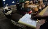 REPUBLIKA.CO.ID, JAKARTA -- Pekerja mendata paket motor sebelum dikirim melalui jasa ekspedisi kereta di Jalan Bungur Raya, Senen, Jakarta, Rabu (5/5).