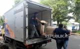 Pekerja bersiap menaikan paket motor ke dalam truk sebelum dikirim melalui jasa ekspedisi kereta di Jalan Bungur Raya, Senen, Jakarta, Rabu (5/5). Meskipun pengiriman motor ke berbagai kota di pulau Jawa mengalami peningkatan seiring mendekatnya hari raya Lebaran, Namun menurut pekerja jumlah pengiriman paket motor menurun sejak 2 tahun ini akibat imbas pandemi dibandingkan sebelum pandemi Covid-19Prayogi/Republika. (FOTO : Prayogi/Republika.)