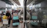Calon penumpang pesawat membawa barang bawaan di area Terminal Bandara Internasional Juanda Surabaya di Sidoarjo, Jawa Timur, Rabu (5/5/2021). Jelang pemberlakuan larangan mudik Hari Raya Idul Fitri 1442 Hijriah pada 6-17 Mei 2021, aktivitas di Bandara Juanda terpantau ramai dengan jumlah penumpang sekitar 23.000 orang. (FOTO : Antara/Umarul Faruq)