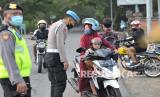 Polisi menghentikan pengendara motor yang hendak menyeberang ke Jawa karena tidak melengkapi diri dengan surat izin khusus saat dimulainya penyekatan mudik Lebaran di Pos Penyekatan kawasan Cekik, Pelabuhan Gilimanuk, Bali, Kamis (6/5/2021). Petugas gabungan mulai menyekat jalur mudik sejak Kamis (6/5) pukul 00.00 Wita dan penyeberangan Gilimanuk-Ketapang ditutup bagi pemudik hingga 17 Mei 2021 dalam upaya mencegah penyebaran COVID-19. (FOTO : Antara/Nyoman Budhiana)