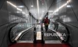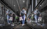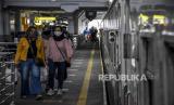 Sejumlah penumpang berjalan menuju kereta api lokal Bandung Raya di Stasiun Bandung, Kota Bandung, Kamis (6/5). PT KAI Daop 2 Bandung memberhentikan layanan perjalanan Kereta Api jarak jauh untuk mudik pada penerapan larangan mudik lebaran sejak Kamis (6/5) hingga Senin (17/5) serta melakukan pembatasan operasional kereta lokal dengan mengurangi jadwal perjalanan menjadi 39 perjalanan dan membatasi jam operasional. Foto: Republika/Abdan Syakura (FOTO : REPUBLIKA/ABDAN SYAKURA)