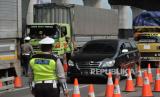 Petugas gabungan melakukan penyekatan mudik di Tol Cikarang Barat KM 31 (arah ke cikampek), Kabupaten Bekasi, Jawa Barat, Kamis (6/5). Penyekatan tersebut dilakukan setelah penerapan larangan mudik lebaran yang mulai diberlakukan pemerintah pada Kamis (6/5). Data Ditlantas Polda Metro Jaya, pada Kamis (6/5) hingga pukul 05.00 WIB, sebanyak 725 kendaraan diputar balik di penyekatan Tol Cikarang Barat dan Cikupa. Foto : Edwin Putranto/Republika (FOTO : Republika/Edwin Dwi Putranto)