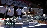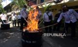 Polisi memusnahkan barang bukti saat konferensi pers hasil pengungkapan kasus narkotika di Mapolda Bali, Denpasar, Bali, Kamis (6/5/2021). Ditresnarkoba Polda Bali memusnahkan barang bukti narkotika hasil pengungkapan selama periode 1 April-6 Mei 2021 berupa sabu-sabu 748,13 gram netto, ganja 1.850,59 gram netto, tembakau gorila 253 gram netto, ekstasi 1.800 butir, ekstasi serbuk 37,24 gram netto, psikotropika 67.410 butir dengan jumlah tersangka 71 orang. (FOTO : Antara/Nyoman Hendra Wibowo)