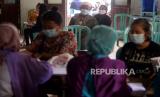 Petugas dari Puskesmas Kecamatan Pulogadung melakukan screening kesehatan warga sebelum divaksin COVID-19 di Balai Warga Rw 01 Pulogadung, Jakarta, Jumat (7/5). Kegiatan vaksin yanng menyasar warga usia 18-59 yang berada di RW pemukiman padat/kumuh tersebut setiap harinya menargetkan sebanyak 100 warga divaksin yang berlangsung sejak 5 hingga 12 Mei mendatang. (FOTO : Prayogi/Republika.)