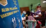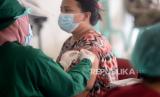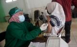 Petugas dari Puskesmas Kecamatan Pulogadung menyuntikan vaksin COVID-19 di Balai Warga Rw 01 Pulogadung, Jakarta, Jumat (7/5). Kegiatan vaksin yanng menyasar warga usia 18-59 yang berada di RW pemukiman padat/kumuh tersebut setiap harinya menargetkan sebanyak 100 warga divaksin yang berlangsung sejak 5 hingga 12 Mei mendatang.Prayogi/Republika (FOTO : Prayogi/Republika.)