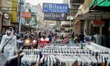 Pengunjung memilih sandal di Pasar Baru, Jakarta, Jumat (7/4). Selama bulan Ramadhan hingga menjelang Idul Fitri 1442 Hijriyah, sejumlah pedagang mengaku mengalami kenaikan pendapatan hingga 30 persen. Republika/Thoudy Badai (FOTO : Republika/Thoudy Badai)