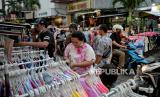 Pengunjung memilih pakaian di Pasar Baru, Jakarta, Jumat (7/4). Selama bulan Ramadhan hingga menjelang Idul Fitri 1442 Hijriyah, sejumlah pedagang mengaku mengalami kenaikan pendapatan hingga 30 persen. Republika/Thoudy Badai (FOTO : Republika/Thoudy Badai)